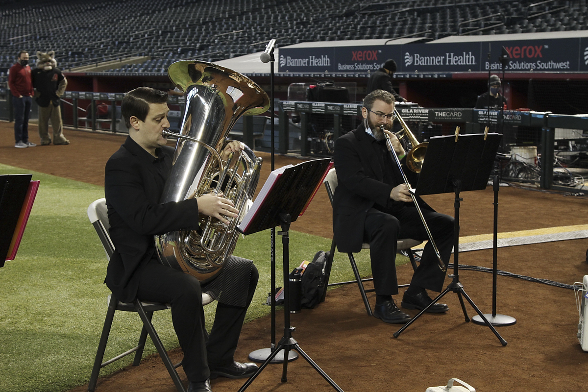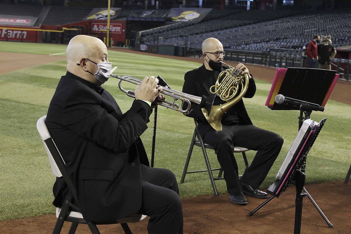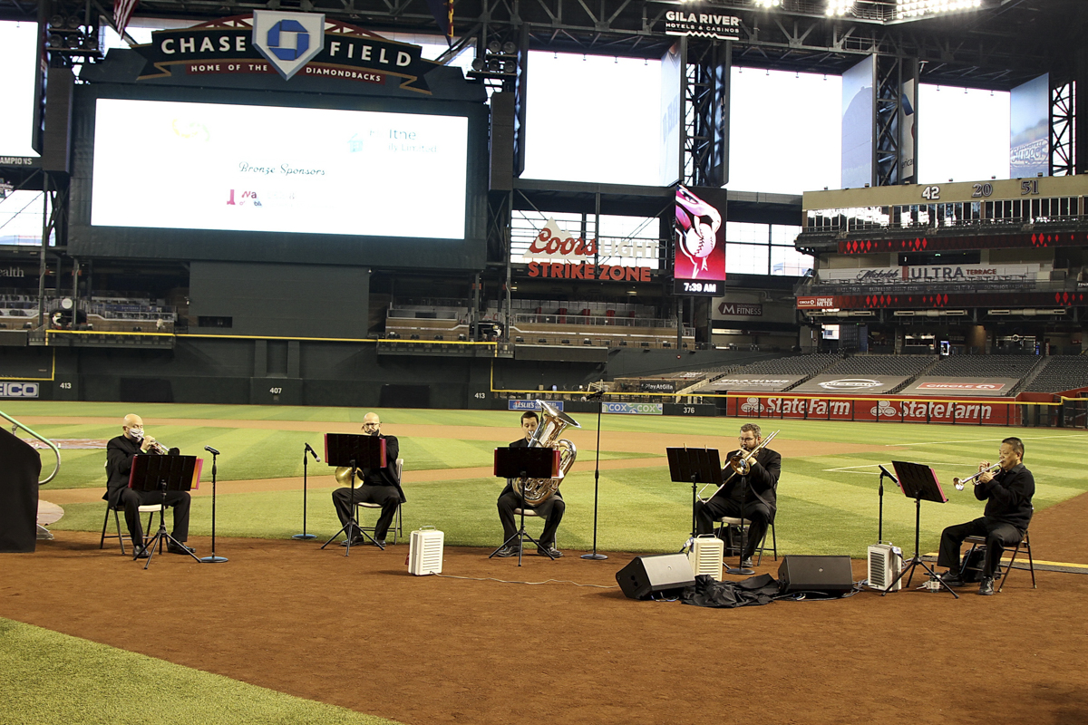 The event also featured a performance by the Phoenix Symphony brass quintet, the first performance by orchestra members this year following cancelation of the season because of the pandemic. Arizona Diamondbacks’ mascot Baxter made a special appearance.